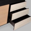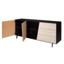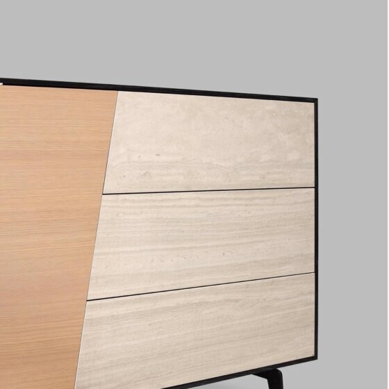 Featuring an original French design, our contemporary Reflet 2-door, 3-drawer enfilade in natural oak breathes new life into our craftsmanship. Its slanted door gives this high-end piece of furniture a bold, innovative look that instantly transforms the surrounding space. Its ceramic drawers, with a unique travertine look, add rich texture and stunning contrast to the overall aesthetic of the cabinet.