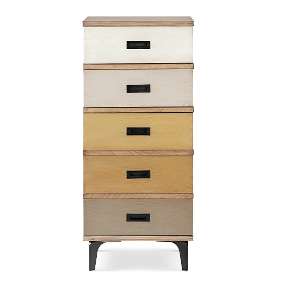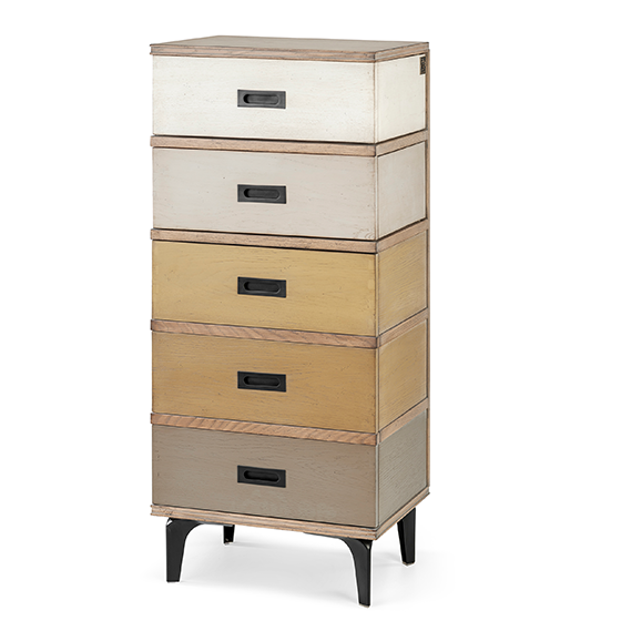 Carefully crafted, it combines a solid oak and oak-veneered MDF carcass, finished in a light antiqued oak with a matte sand tone, with lacquered drawers in subtle shades of arum, nacre, nutmeg, clay and taupe. The matte black metal legs and drawer handles enhance its graphic, contemporary character. Designed to blend seamlessly into a variety of interiors, this piece reflects refined craftsmanship and meticulous attention to detail.