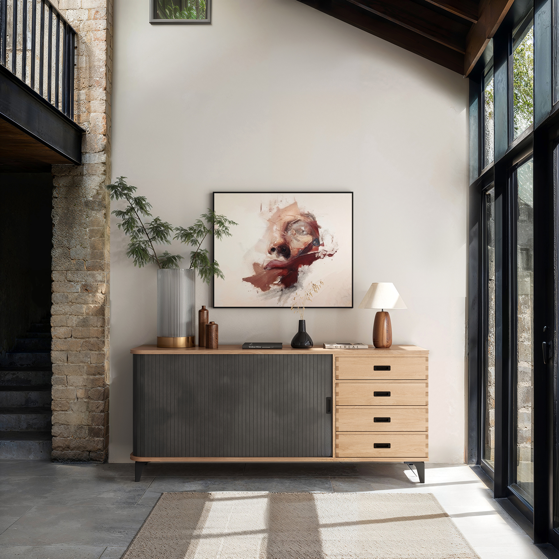 Discover the VORTEX Sideboard, a durable piece of furniture that combines elegance and authenticity. Entirely handcrafted using traditional artisan techniques, it reflects exceptional craftsmanship, with every detail carefully refined to the highest standard. Its sophisticated design, enhanced by a large tambour curtain that is both practical and aesthetically pleasing, blends seamlessly into any interior—be it classic or contemporary.
