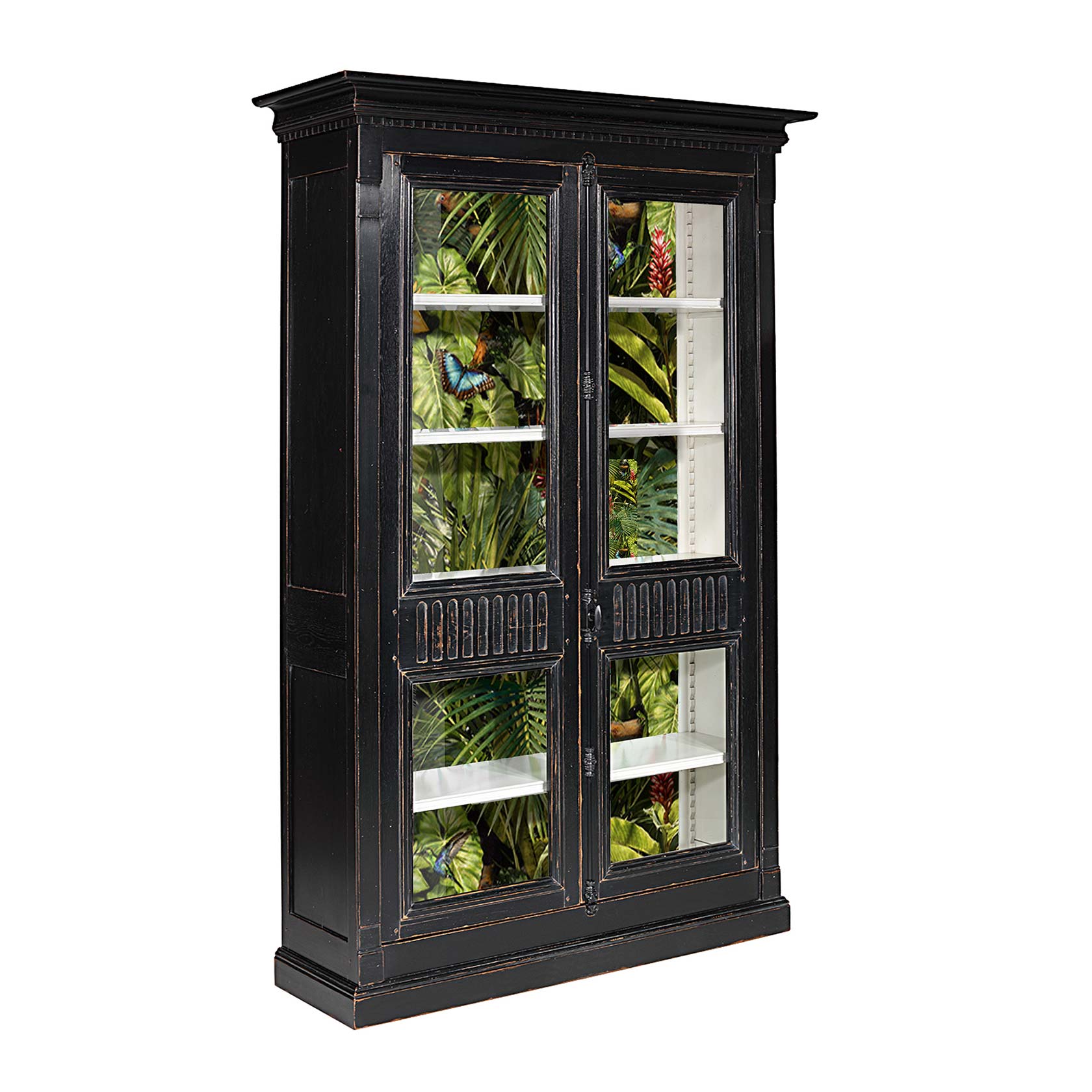 Tilleul et MDF plaqué 4 étagères et 2 tiroirs intérieurs Crémaillères bois Panneau arrière décoré d’un papier peint Caisse laque “Noir patrimoine” Intérieur laque “Boréal patrimoine” Papier peint NEODKO Ce meuble ne nécessite pas d’assemblage à la livraison Plus-value structure chêne 15%