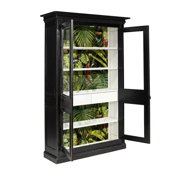 Tilleul et MDF plaqué 4 étagères et 2 tiroirs intérieurs Crémaillères bois Panneau arrière décoré d’un papier peint Caisse laque “Noir patrimoine” Intérieur laque “Boréal patrimoine” Papier peint NEODKO Ce meuble ne nécessite pas d’assemblage à la livraison Plus-value structure chêne 15%