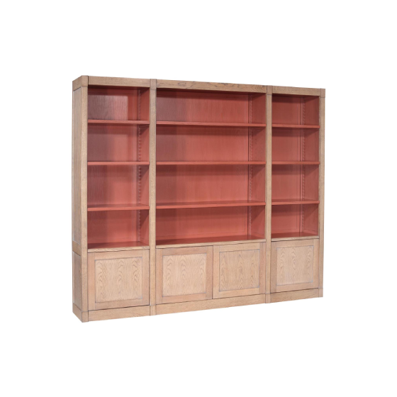 Chêne et MDF plaqué 2 modules de 60 cm et 1 de 120 cm 4 portes 4 étagères réglables par trame et 1 fixe au dessus des portes Extérieur et façade teinte «Sable léger antiquaire brossé» Intérieur laque «Brique» Meuble livré entièrement démonté Prestation de montage proposée