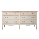 Merisier et MDF plaqué 6 tiroirs Caisse laque “Vieux gris léger antiquaire” Champs du plateau et platebande des tiroirs laque “Arum léger antiquaire” Dessus merisier teinte “Pécan léger antiquaire”