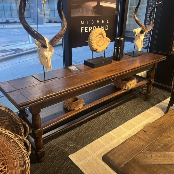 Voyez grand avec notre très grande table de chasse à pieds tournés, aussi appelée Console de Vénerie. Cette table, qui autrefois servait de billot pour préparer le gibier dans les relais de chasse, a été magnifiquement transformée pour répondre aux exigences de votre vie moderne. Ses élégantes charnières permettent de l’utiliser comme une vraie seconde table lorsque vous recevez, ajoutant une capacité d’accueil précieuse. Elle peut également servir de grand bureau pour télétravailler, combinant fonctionnalité et élégance. Chaque console est le fruit d’une fabrication artisanale traditionnelle, fait à la main avec soin. Ce processus assure une pièce haut de gamme qui n’est pas seulement belle, mais aussi durable. Nous savons que chaque maison est unique. C’est pourquoi nous vous proposons la possibilité de sur-mesure. Adaptez cette console à votre espace et à vos besoins, pour une intégration parfaite. Pour parfaire cette offre, nous proposons un très grand choix de finitions. Personnalisez votre table pour qu’elle corresponde à votre goût et s’intègre harmonieusement à votre intérieur. Optez pour notre Console de Vénerie et ajoutez une touche d’élégance et de qualité à votre maison. Une pièce unique qui allie histoire. durabilité et adaptabilité.