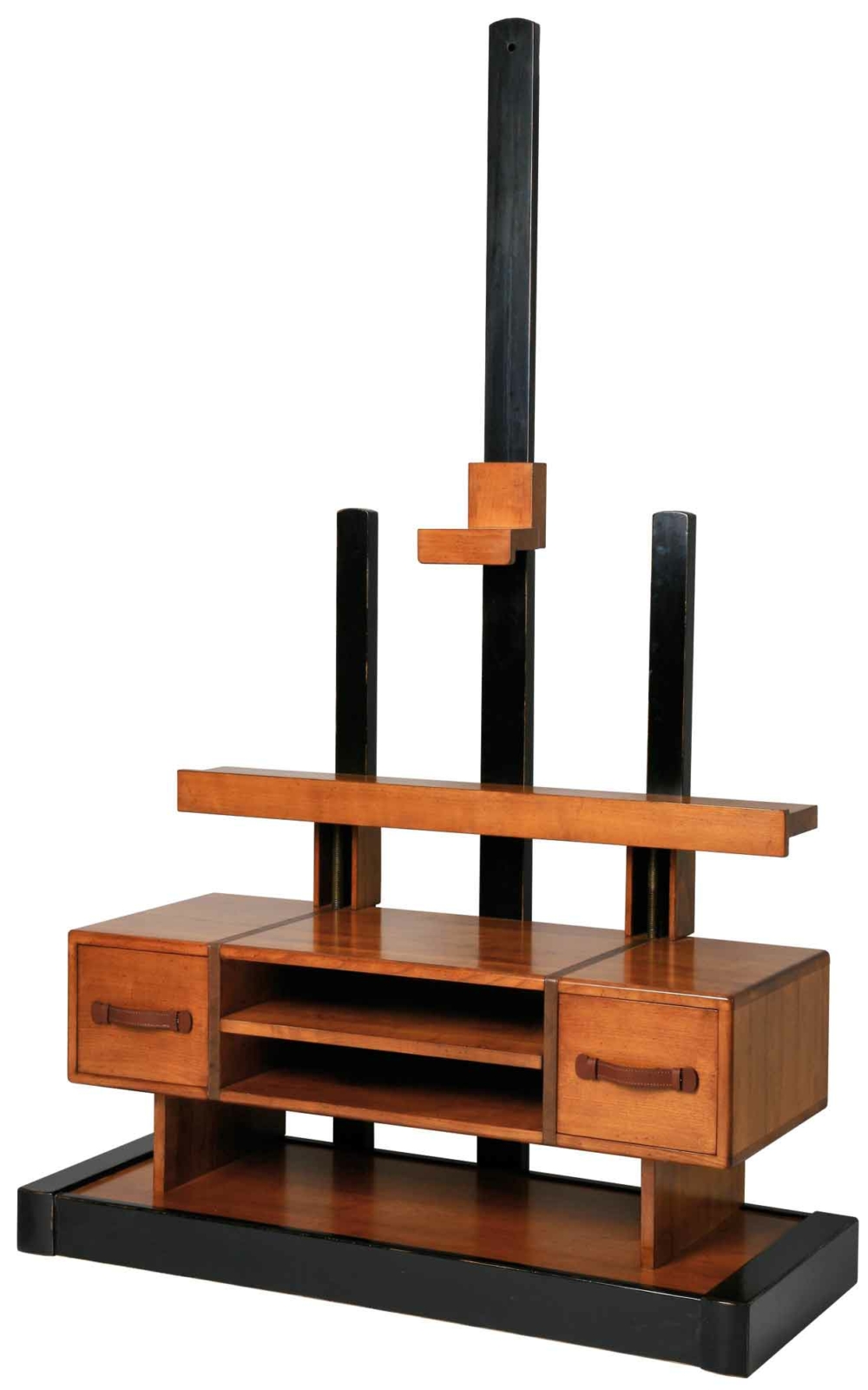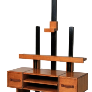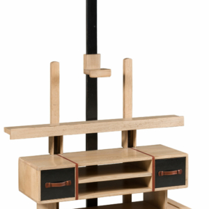 Merisier et Chêne MDF plaqué 2 tiroirs. 1 étagère sur taquets dans la niche qui est ouverte à l’arrière Sur roulettes Poignées et lanières en cuir